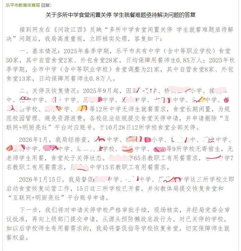 目前确实有多所学校因无师生就餐需求,食堂持久闲置,为规范校园办理、避免资本华侈,依法依规将食堂关停。对于几所存正在师生就餐需求的学校,已督促当即启动食堂恢复营运工做,恢复开餐,并向教体局提交恢复食堂和“互联网+明厨亮灶”平台账号申请。